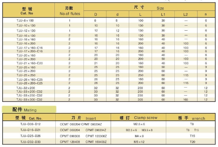 TJU钻铣刀产品性能: 钻铣共用,应用范围广,切削阻力小,负荷轻。 负荷轻TJU钻铣刀,范围广铣刀杆,立铣刀生产厂家 TJU钻铣刀产品参数: